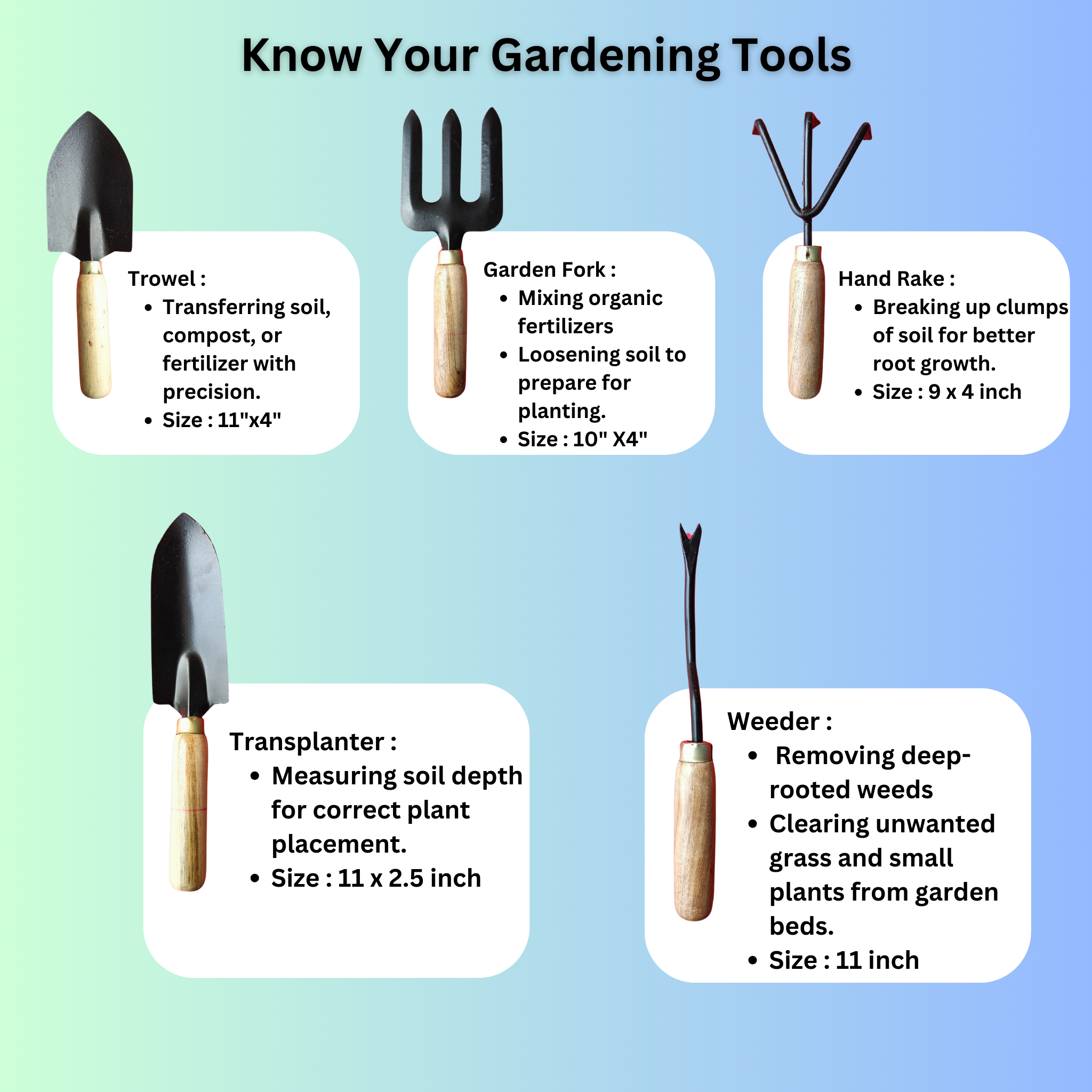 Tools set: Garden Fork, Weeder, Trowel, Transplanter,  and  Hand Rake